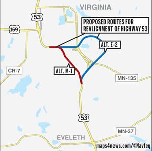 The Minnesota Department of Transportation has identified potential routes for a realignment of Highway 53 around Virginia and Eveleth.